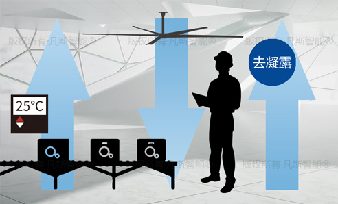 春秋季早晚氣溫、濕度變化大,地面、設(shè)備表面容易產(chǎn)生凝露。大型工業(yè)風(fēng)扇的微風(fēng)氣流帶水汽,抑制凝露,防止設(shè)備損壞、地面打滑。