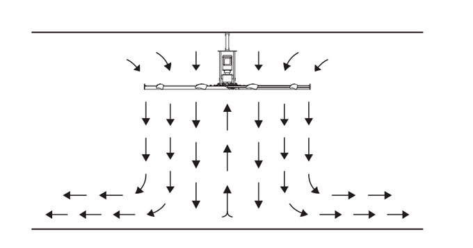 氣流從大型吊扇扇葉向地面吹動(dòng),當(dāng)氣流撞擊地面時(shí),它會(huì)向各個(gè)方向向外推送,往外不斷延伸,直至最大傳送距離或障礙物。