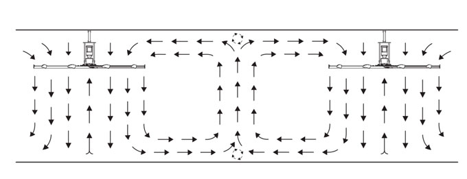 當(dāng)有多個(gè)適當(dāng)間隔的大型吊扇時(shí),相鄰的氣流流相遇形成壓力區(qū)。壓力區(qū)就像一堵墻,使得每個(gè)吊扇都像一個(gè)封閉的風(fēng)扇。通常,當(dāng)一臺(tái)吊扇與其他風(fēng)扇一起工作時(shí),它的性能會(huì)提高。